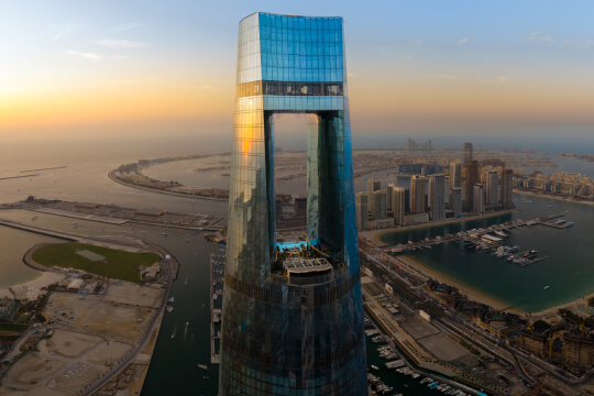 Guests can enjoy 360-degree panoramic views of Dubai Marina, Palm Jumeirah and the Arabian Gulf from the hotel’s glass observation deck, a standout feature among hotels Dubai Marina is famous for.
